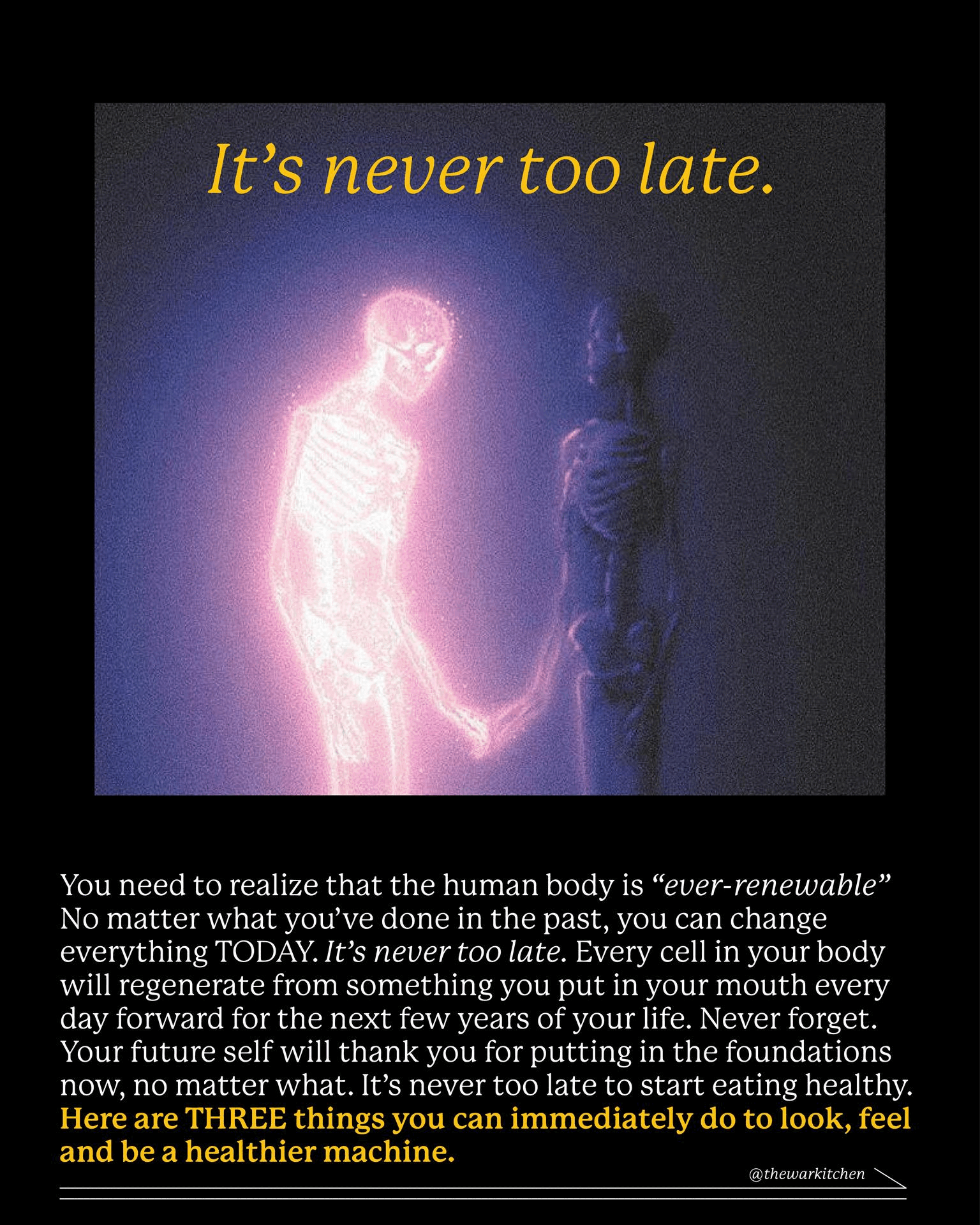 What we want you to understand is that no matter how bad things might seem, there’s always hope. The human body is “ever-renewable”. No matter what you’ve done in the past, you can change everything TODAY. It’s never too late. Every cell in your body will regenerate from something you put in your mouth every day forward for the next few years of your life. Never forget that.