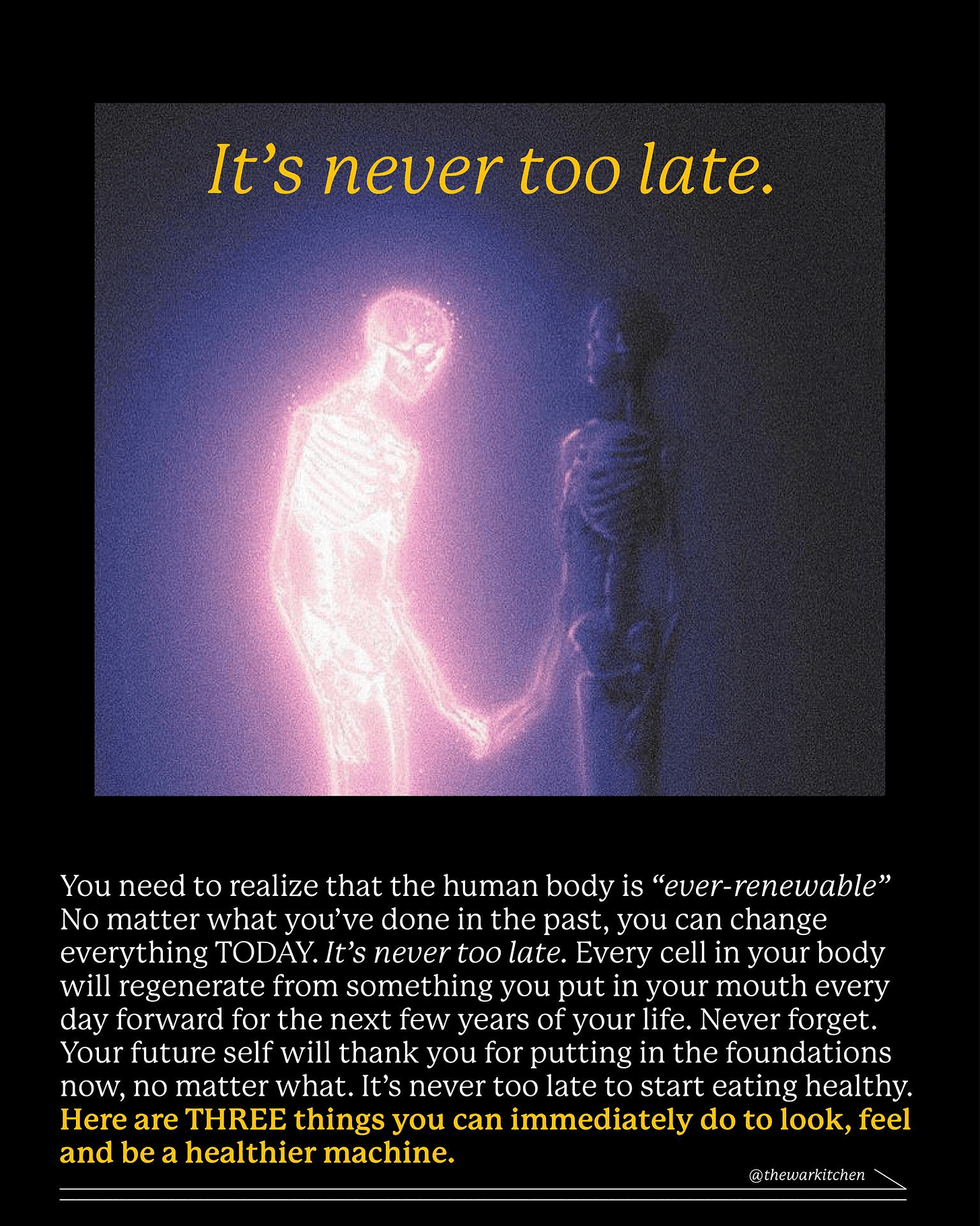 One post that resonated well this week was this concept of the human body being “ever renewable”. The doomer mindset is very popular on social media, and sometimes it makes people think that they’re beyond saving. “Seed oils stay in your body for 6 years!! There are microplastics in everything you’re eating!! Look at the toxins you’re consuming everyday!!”. While there’s merit to some of these claims, and many of them are helpful when presented properly, a lot of the time this fear-mongering is just easy engagement farming.
