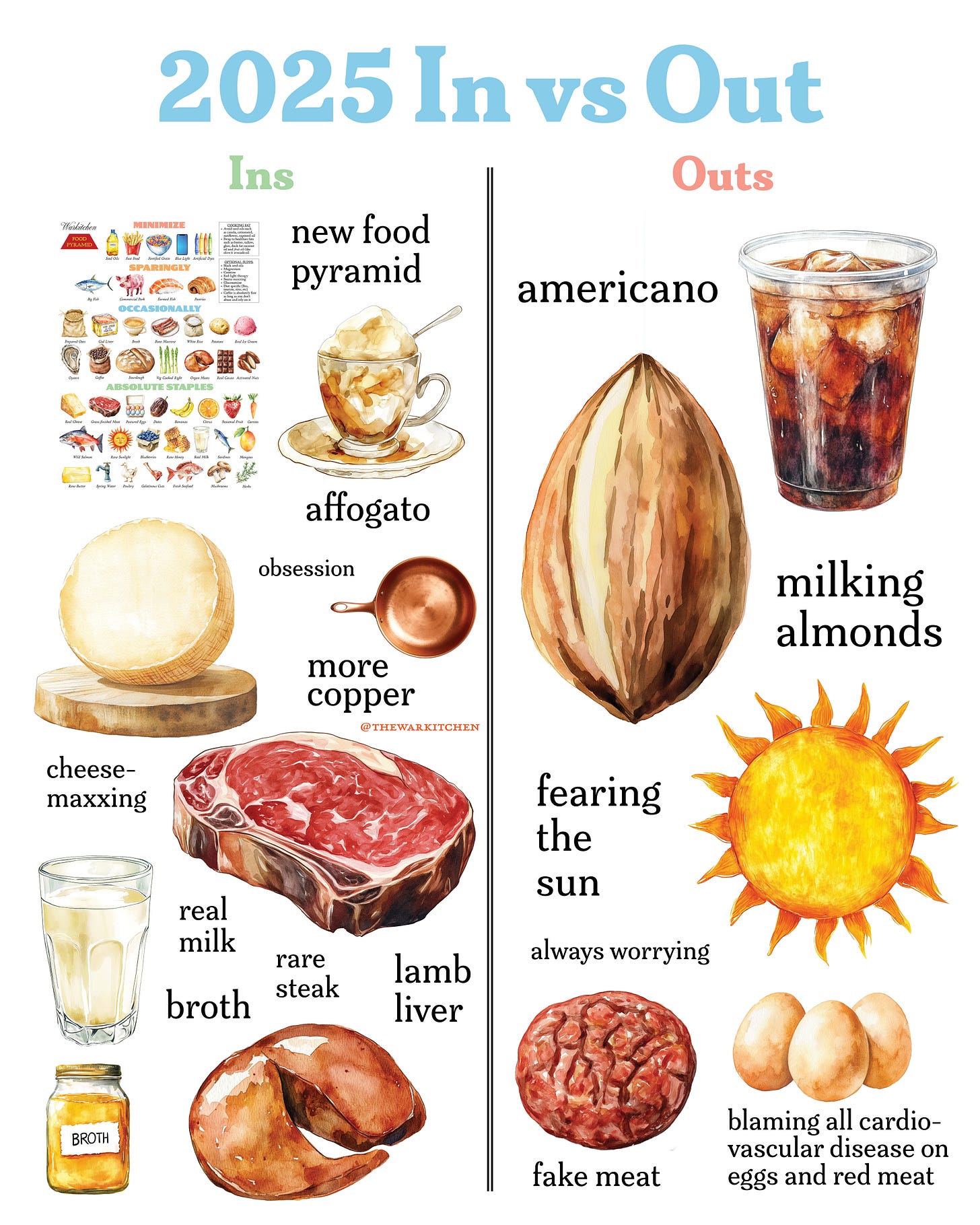 While this was (half) a joke, the end of the year is a great day to reflect on what you’d like to leave behind and what to bring with you into 2025. I don’t know about you, but I feel like there’s been a visceral shift in the world in these last few months. More people than ever seem to care about their health. More people than ever seem to care about what’s in their food. What toxins are in their environment. How they could lead healthier lives. Seed oils are now mainstream. People are waking up to the fake meat agenda. And it seems like things are only going to get better. While this is in no way a definitive list, here are some of the ins & outs that have stood out.
