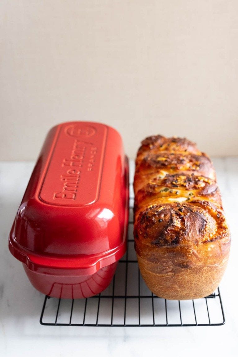 I baked this jalapeño cheese bread in the Emile Henry Glazed Long Covered Baker, which I am obsessed with. The closed vessel created a beautifully crisp, thin, caramelized crust without adding steam to the oven. My five-minute dough made with King Arthur Baking Company Bread Flour is rolled with cheese and jalapeños! So easy, super delicious! This is Perfect for the Big Game!