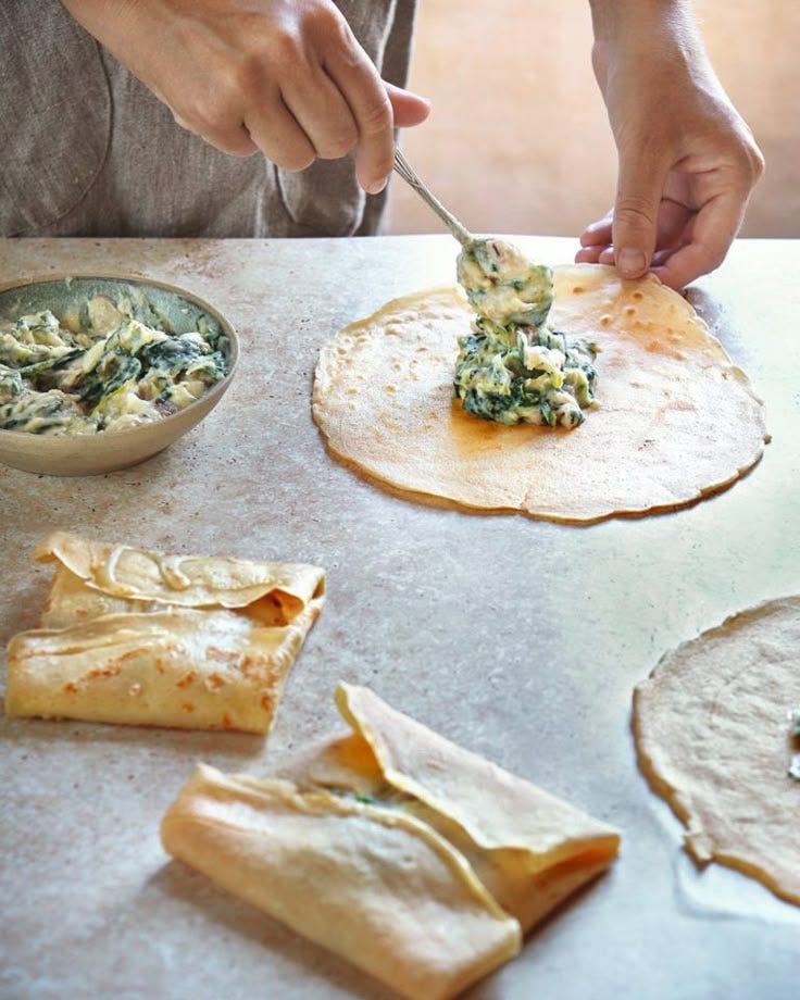 These savoury pancakes from food writer Ursula Ferrigno hail from southern Italy, where they’re known as soffiantini or ‘whispers’. The pancakes are stuffed with spinach, mozzarella and Parma ham and baked until golden. Prep ahead for an easy dinner.