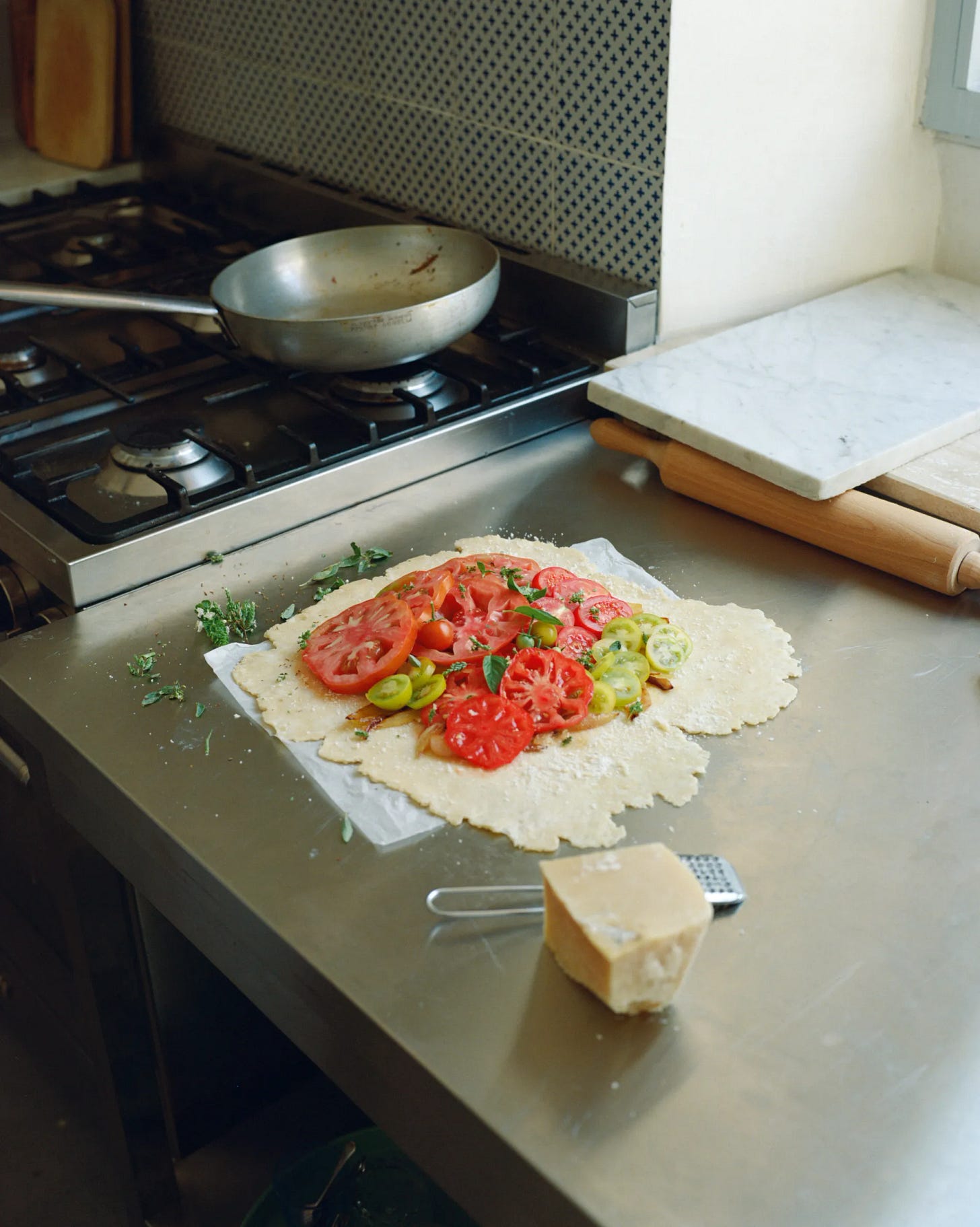 When I can get my hands on true, sun-drenched summer tomatoes I want to do as little to them as possible before eating them. Vine-ripened and warmed by the summer sun, all they need is slicing with a sharp knife, and then a big glug of extra-virgin olive oil, a sprinkle of flaky salt and a few young basil leaves. I also love cosying up fresh cheese like ricotta beside the tomato; a quartered piece of stone fruit might make its way onto the plate too. Another way to turn really good tomatoes into a meal is to make this flaky crostata. Onions are cooked down until they are a caramel colour before being hidden under a layer of jewel-like summer tomatoes. Lots of black pepper, olive oil, flaky salt and fresh oregano, thyme and basil are scattered and drizzled over the top. Serve with a crisp salad on the side and some wine, for a light and cool meal under the hot summer sun.