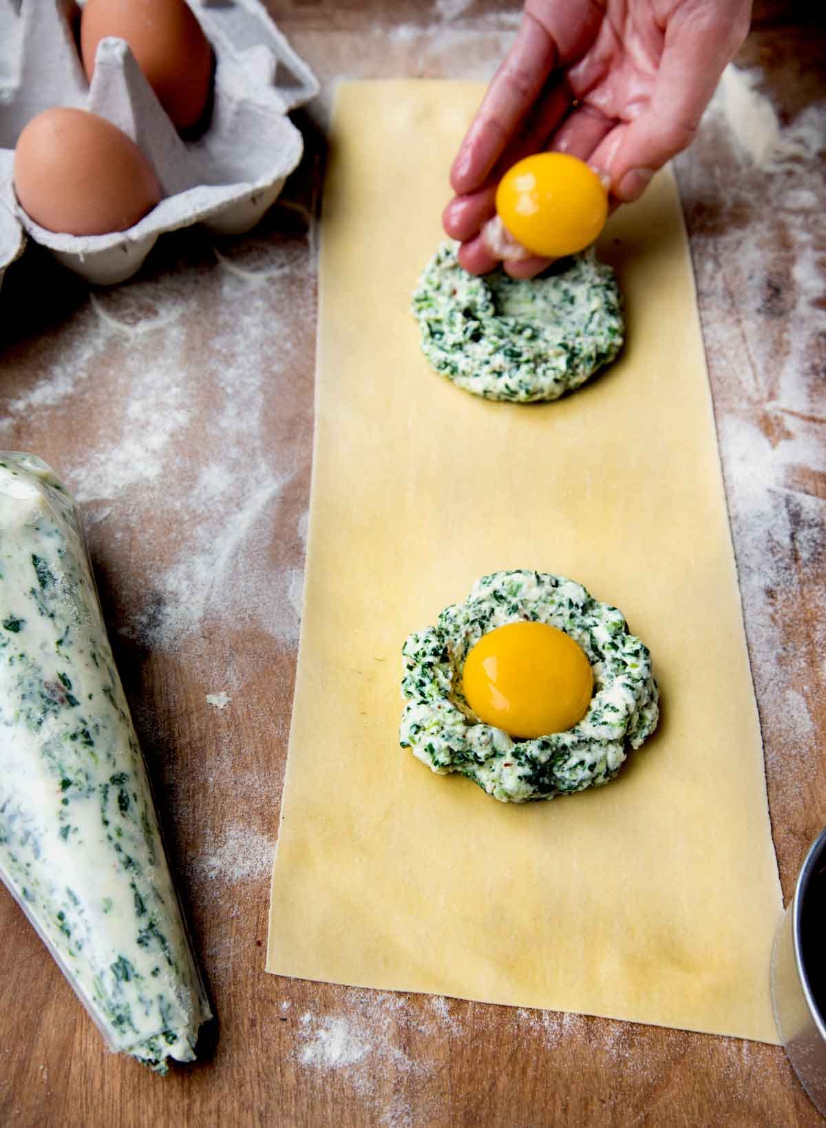 The first time I encountered raviolo al uovo, a giant raviolo (raviolo is the singular of ravioli) stuffed with ricotta, spinach and a runny egg yolk was at Trattoria Monti in Rome many moons ago (almost 20 years, yikes, time flies). It was one of those memorable dishes that leaves a lasting impression. When you cut into the pasta, the yolk oozes out, mixing with the cheese filling and sauce, creating a creamy, unctuous bite of food. I’ve been thinking about that raviolo ever since. It was served simply with a butter sauce and shaved white truffle on top. Divine!
