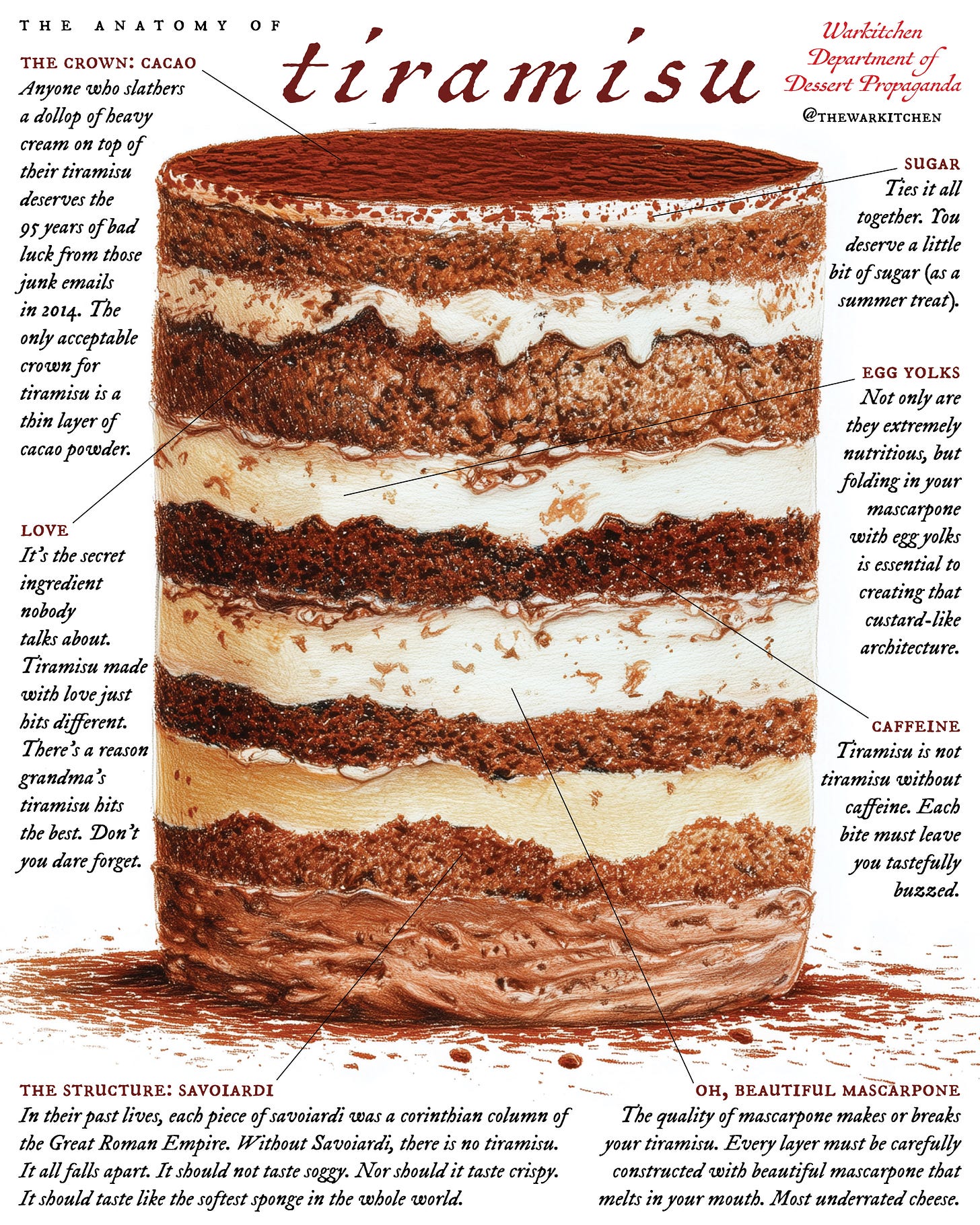 The caveat is that the tiramisu has to be made right. No slathering cream on top. No shortcuts. Just authentic tiramisu the way it was meant to be. This is the anatomy of real tiramisu.