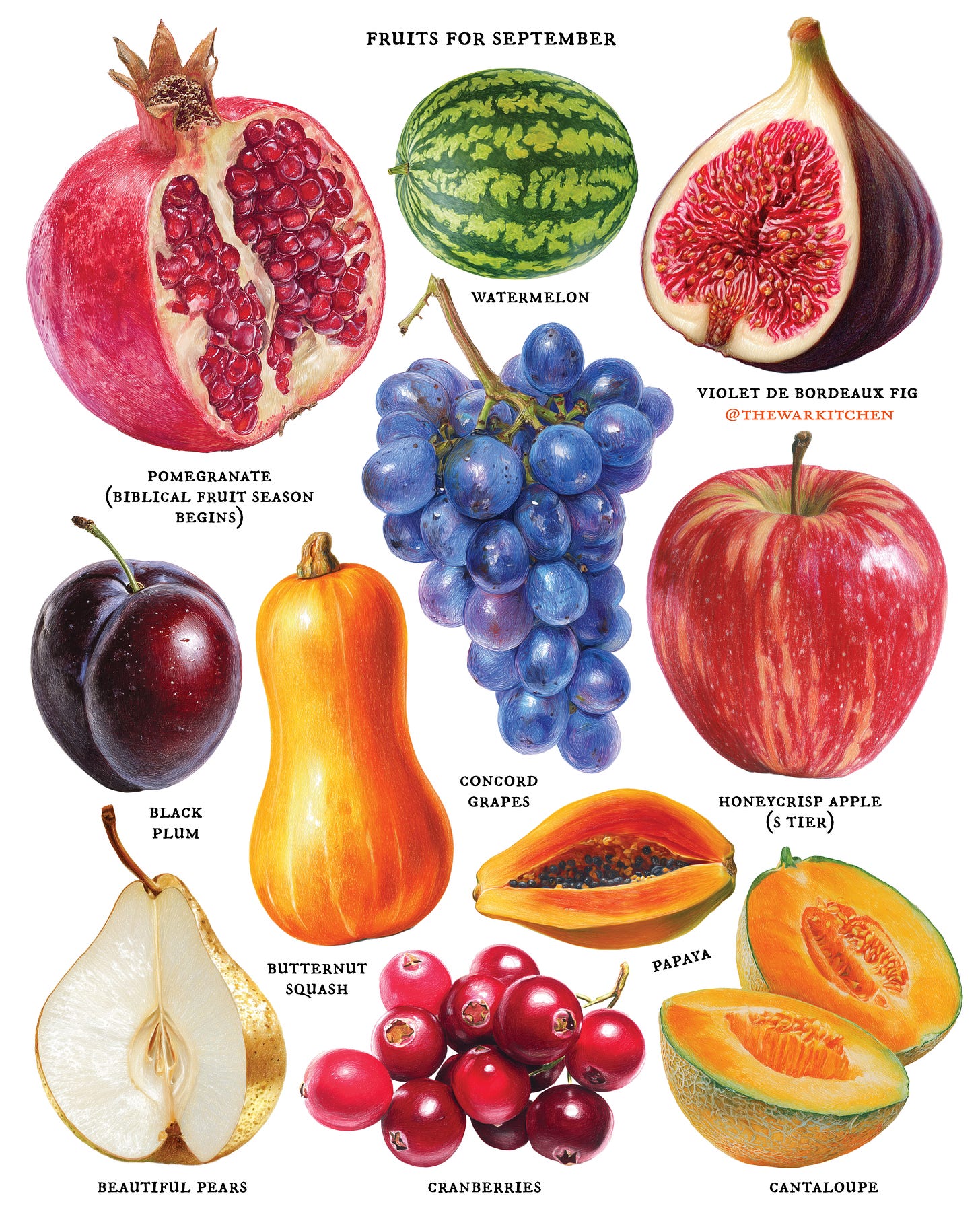 September marks the start of biblical fruit season. The days are getting shorter. Pomegranates are back. Figs are at their jammiest. Concord grapes just hit different. If there’s a fruit on this chart that you haven’t yet tried, I implore you to try at least one new fruit as your September resolution!