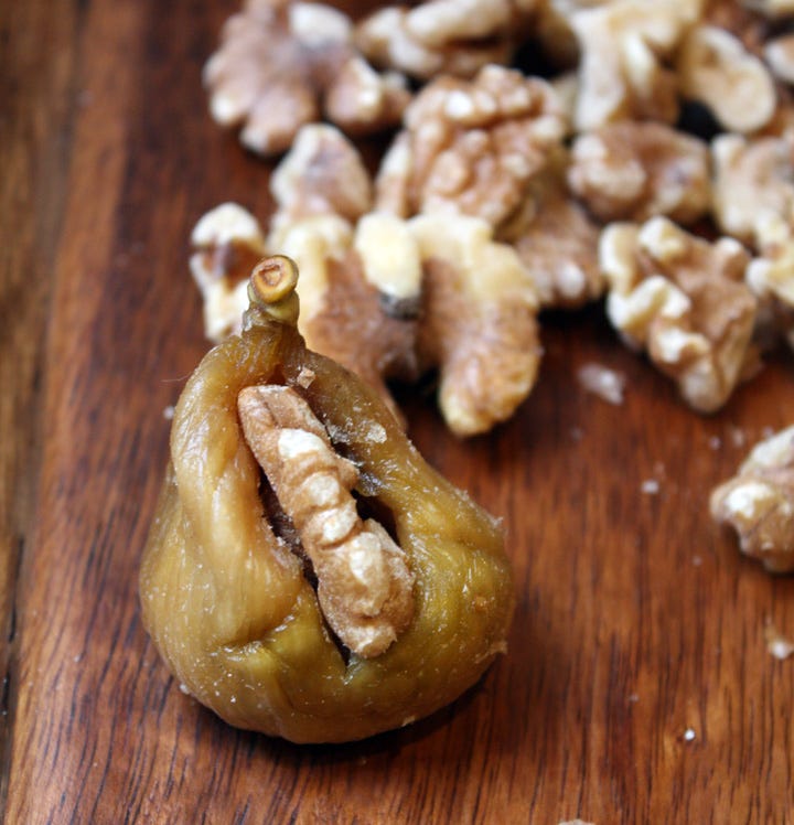 We really didn’t eat a lot of desserts when i was a kid. Usually after dinner, a pot of coffee was brewed and bowls of fresh fruit and nuts were heaved to the table. One particular treat at holiday time was freshly cracked walnuts stuffed into dried figs. This year, I gave the treat a little update by dipping the figs in bittersweet chocolate.