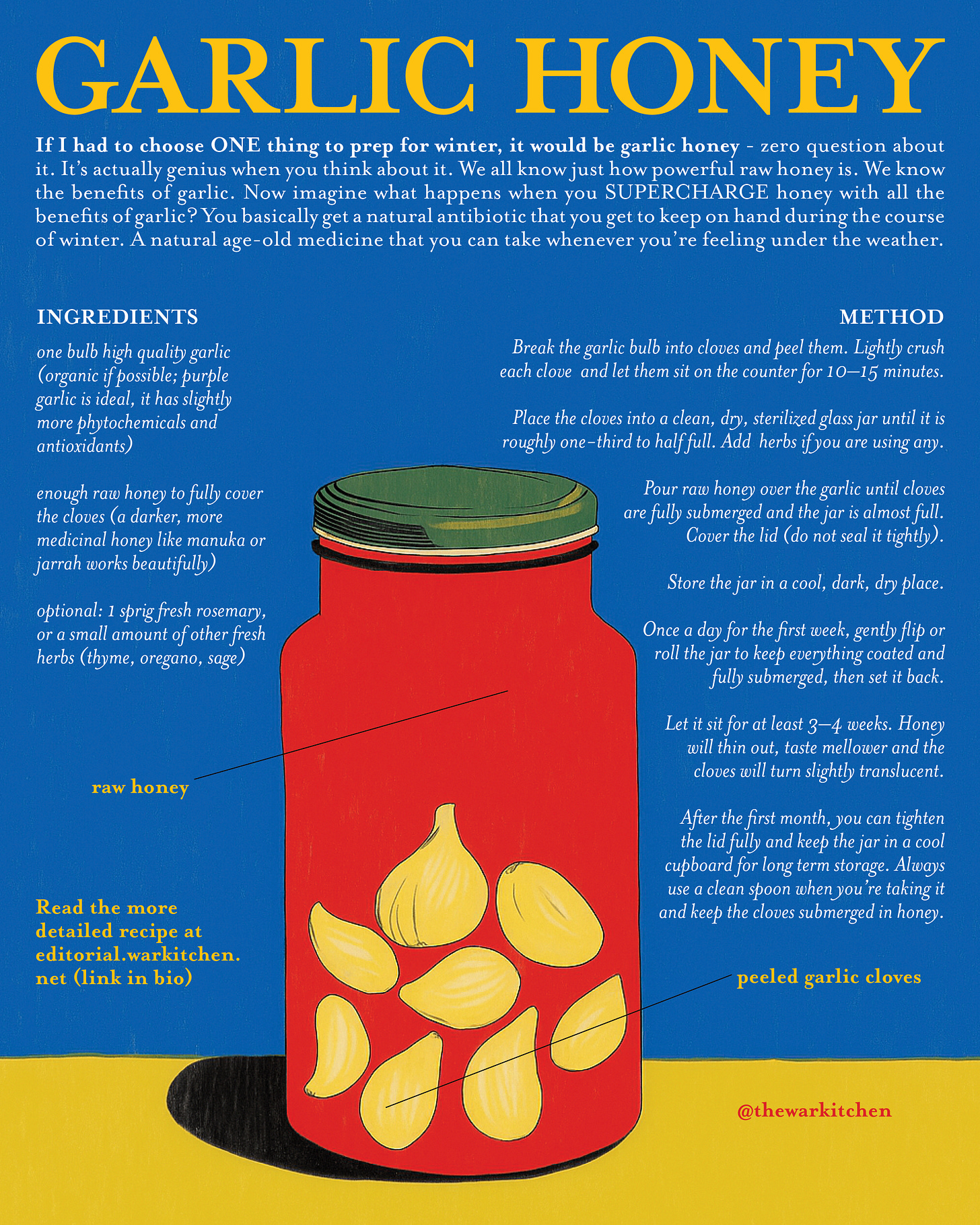 It’s time to start prepping for winter. Make your garlic honeys. Dried herbs. Rosemary infused oil. Brush up on your soup recipes. Stock up on cod liver. Winter cheese. Broth. Honeycomb. A glorious Winter Arc is about to begin.