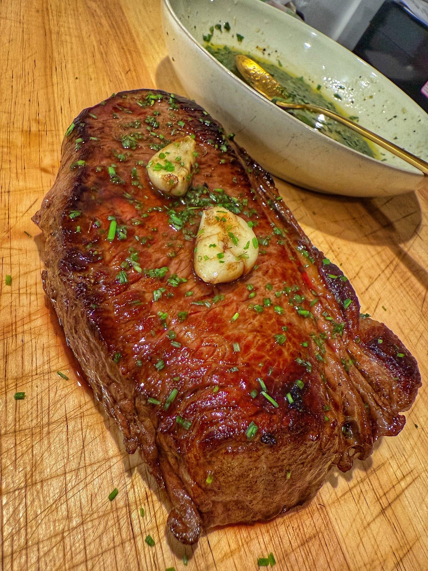 When it’s time to sear, the steak is already warm and dry, allowing you to build a deeper crust faster and more cleanly. Flipping the steak every 30–45 seconds keeps the surface temperature high, promotes even browning, and prevents scorching giving you better color in less time.