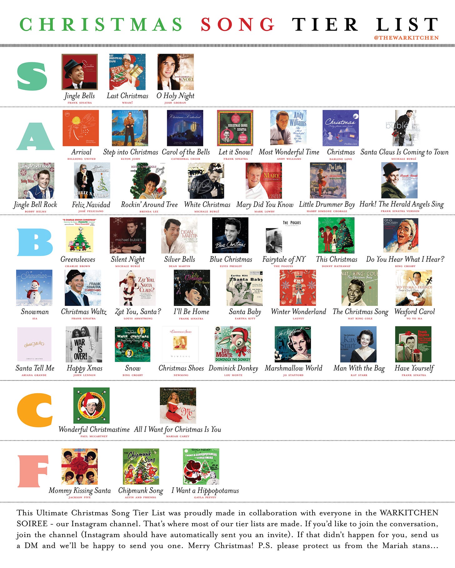 Now, let’s move on to Christmas songs! Mariah Carey was unanimously voted down this year, largely due to just how repetitive All I want for Christmas is You has become. These days you can just be going about your day in early November and you’ll randomly start hearing it somewhere. There’s no surprise that Sinatra tops the list with Jingle Bells with a few more classics in A tier as well. We don’t even need to talk about what’s on F tier…