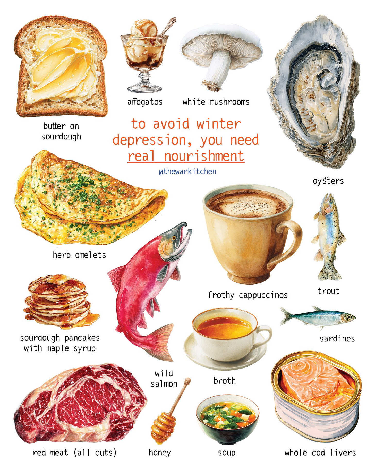 Winter depression is a consequence of a lack of nourishment. Prioritize foods rich in Vitamin D. Get enough zinc. Eat red meat (including organs). Nourish yourself deeply with warm broth and soup. Get your omega 3s from real fish. Eggs. Spend hours reading while you’re tastefully caffeinated. Enjoy some soft French butter spread over sourdough. Nourishment is one (incredibly important) pillar 🥂