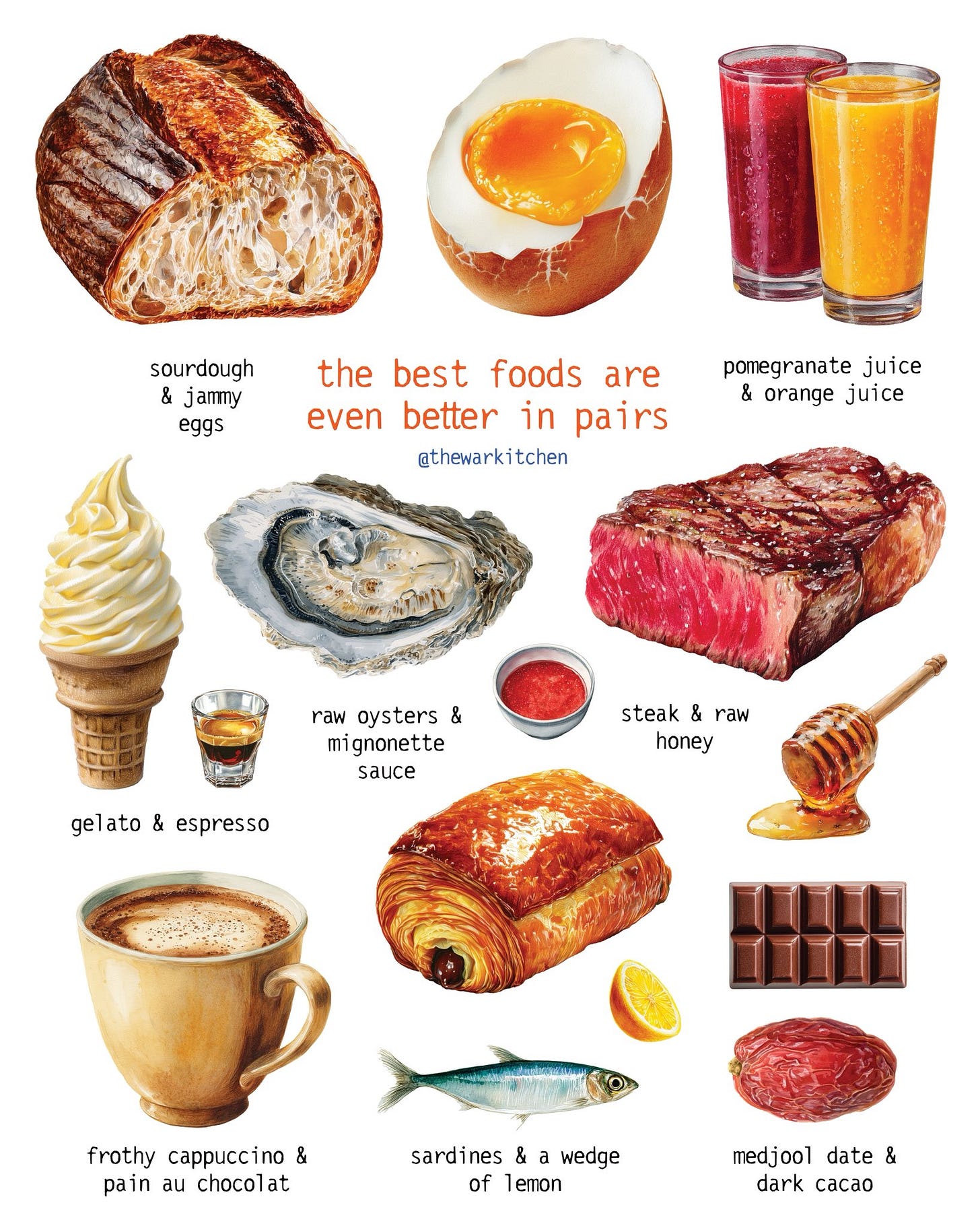 The best foods are even better in pairs. Sourdough and jammy eggs. Gelato and espresso (affogato). Frothy cappuccino and pain au chocolat. Steak and raw honey. What are your favorite food pairs?