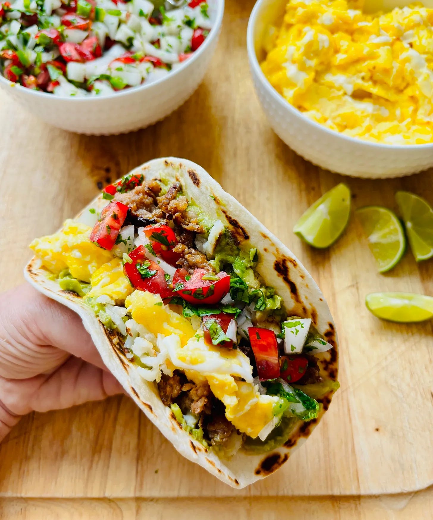It’s easy to prep some of these ingredients ahead of time and reheat when ready to eat. The sausage and hash browns can both be cooked, cooled, and refrigerated for a few hours (or a day) in advance. The pico de gallo can also be made a day ahead. FYI, scrambled eggs are best made right before eating.