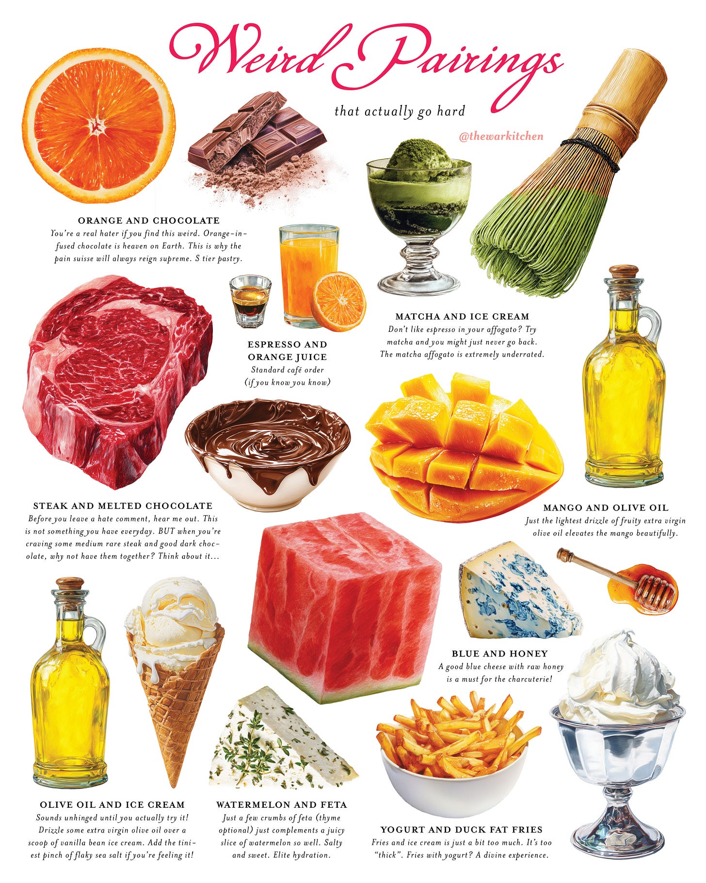 Chocolate and orange look like they come from two different worlds, yet a pain suisse tastes magical. A drizzle of olive oil is the last thing you’d pour over mango yet it works. A tiny bit of blue cheese with honey. Yogurt and fries. And dare I say, dipping a medium rare steak in melted dark chocolate. These are some weird pairings that actually go so hard.