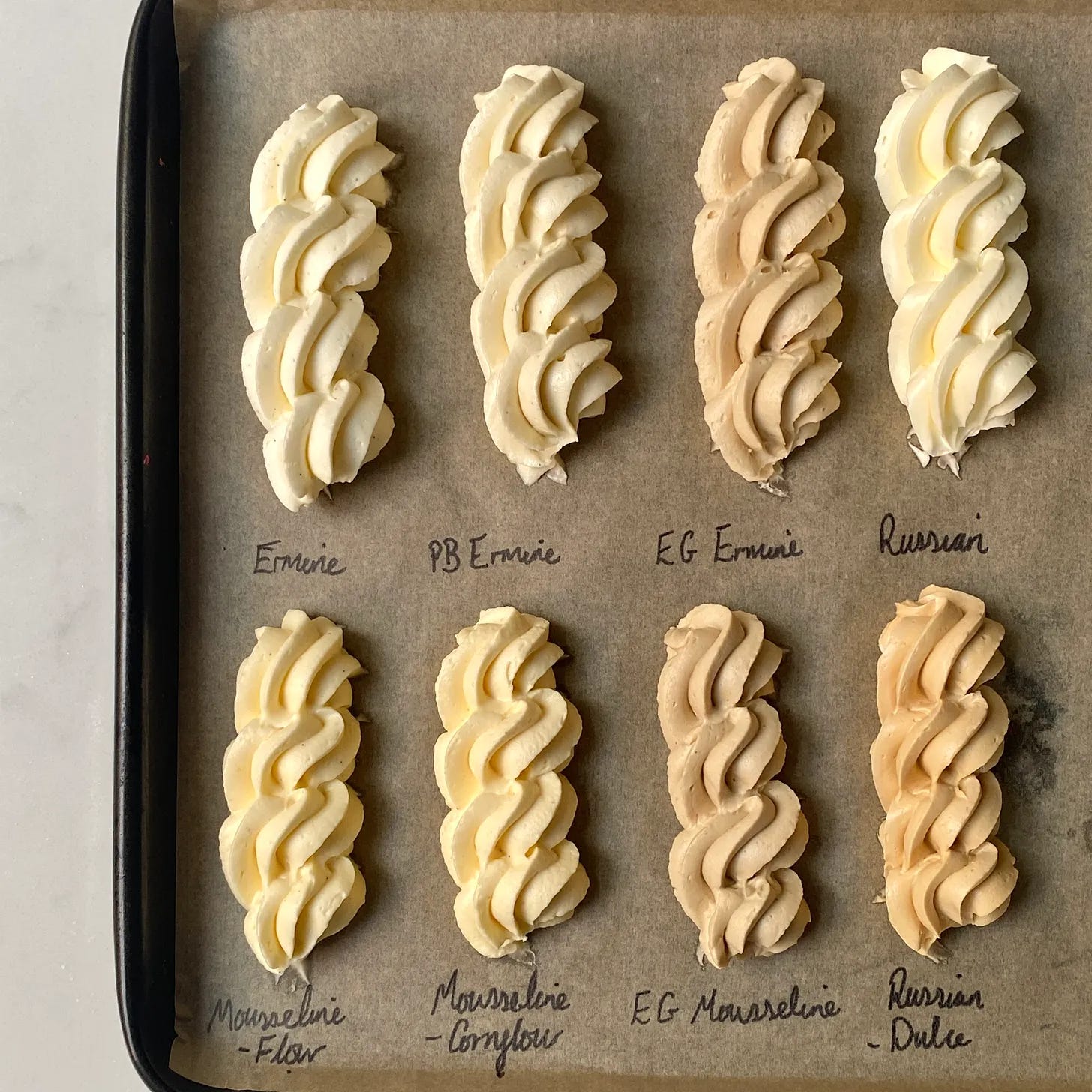 “What I really love about ermine is the potential to infuse the milk with various flavours - herbs, teas and spices all work wonderfully. The finished result is remarkably similar to mousseline so it’s a good option if you want that texture and flavour without messing around with egg yolks. I wouldn’t use this buttercream if you plan on using a lot of add-ins like purees, caramels or pralines, it already contains a lot of liquid meaning that it can collapse or split easily when adding extra ingredients, Swiss and Italian are best for that.