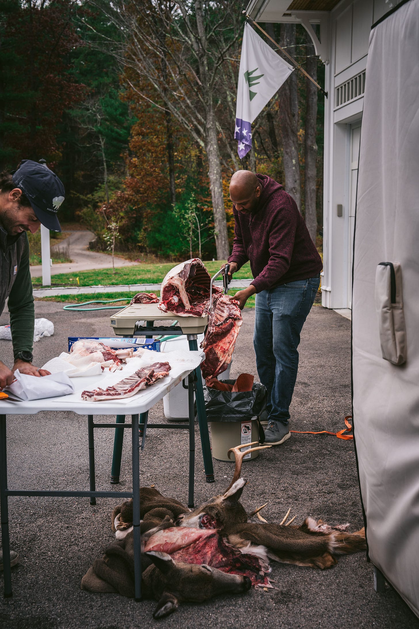 ELI: After Lou finished skinning the buck, I needed to take a moment to collect myself. While he worked on the doe, I sat at a local cafe for a smoothie and some time. When I returned, Master butcher Chris Walker had arrived to help transform the two animals into recognizable cuts. He arrived at the perfect time, to remove the heads and begin the detailed butchering. Cutting the animal from the shoulders, the rib cage, the legs…