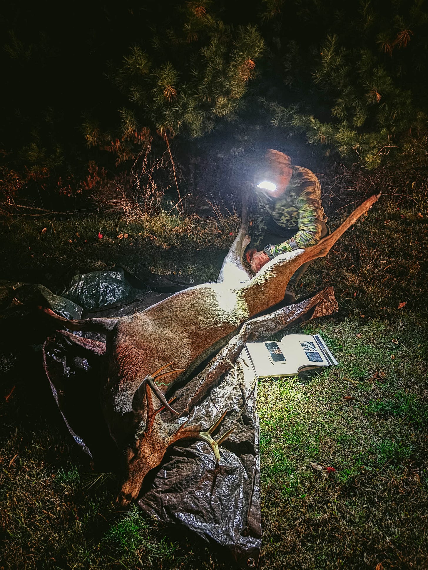 I spent the next several hours tracking, recovering, dragging, dressing, and hanging the two deer. Finally, at midnight, with the deer cold, I seasoned the tenderloins, still warm, and seared them hot and fast on cast iron; I barely let them rest before slicing them and eating them off the cutting board with my hands.