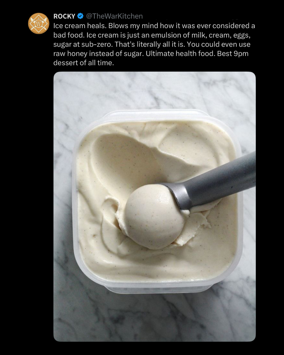 When ice cream is made with real ingredients, the way God intended, it can be enjoyed without worry. Milk, cream, salt, eggs and sugar churned together slowly at sub-zero. Absolute perfection. Calcium, iron, vitamins A, D & K, omega-3s, probiotics, choline, magnesium, protein, C15, and antioxidants to name a few. Eat real ice cream for fertility, skin, hair, longevity, brain health and happiness.