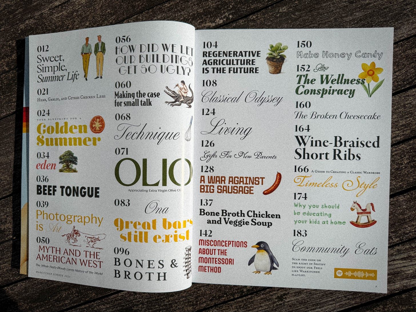 ’s essay on The Great American West. and Mia’s guide for a golden summer. ’s piece on small talk. gift guide for new parents. ’s wellness conspiracy. And so much more… (scroll down for the full contents page).Throughout the week, we’ll highlight some of our favorite pieces right here on our editorial page. The best part of it all? You’ll be able to instantly add the magazine to cart and read it in the real world if you’d like. You don’t need your phone. No need for a computer. You can just lay back - maybe with some great jazz in the background and lose yourself in any page you so choose. The coffee table book is making a resurgent return. Get yours here.