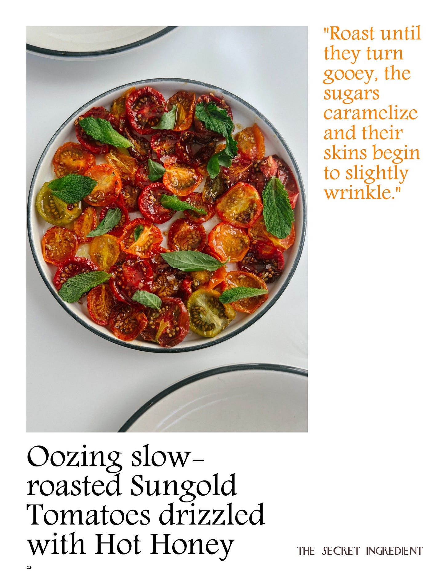 “Adapted from Brooklyn restaurant Misi, these oozing slow roasted sungold tomatoes drizzled with hot honey, fennel & coriander seeds are mind-bendingly easy to make.”