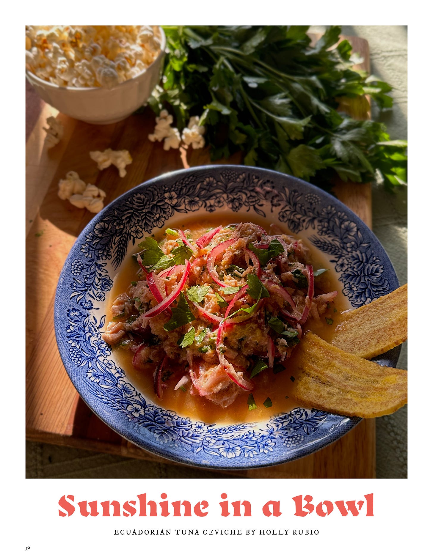 “Bright, zesty, and just a little unexpected, this Ecuadorian Tuna Ceviche brings sunshine to your table. Tender tuna is tossed with extra virgin olive oil, fresh parsley, and loads of sweet orange juice, then paired with lemon-marinated red onions for a burst of tang. After a quick chill to let the flavors mingle, it’s served alongside coconut oil–popped popcorn and crispy plantain chips.”