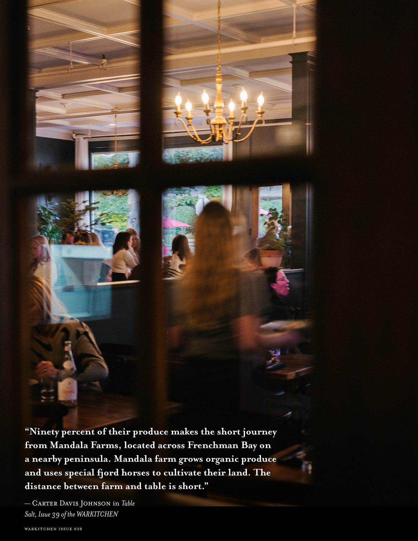 Table Salt’s supply chain is both thoughtful and community-minded. Living in Maine, the seafood is fresh and local (of course). But they do more than seafood. Table Salt offers a variety of classic proteins: lamb shank, ribeye, filet mignon, which are sourced from the American Midwest. Ninety percent of their produce makes the short journey from Mandala Farms, located across Frenchman Bay on a nearby peninsula. Mandala farm grows organic produce and uses special fjord horses to cultivate their land. The distance between farm and table is short.